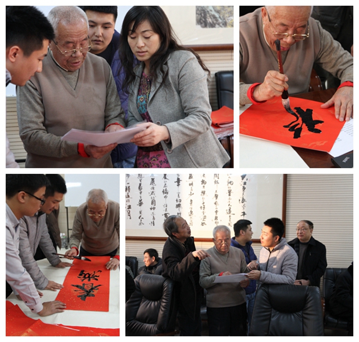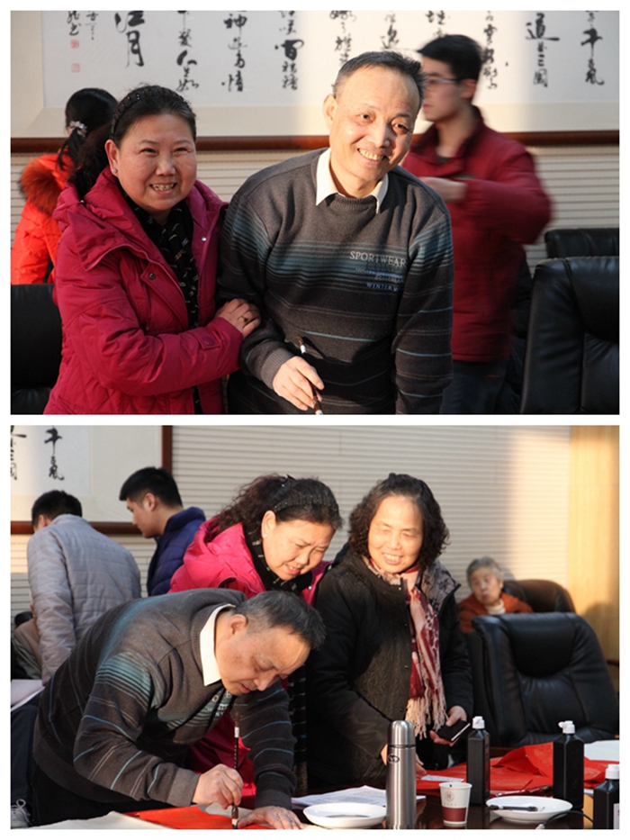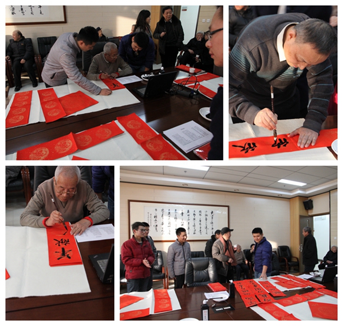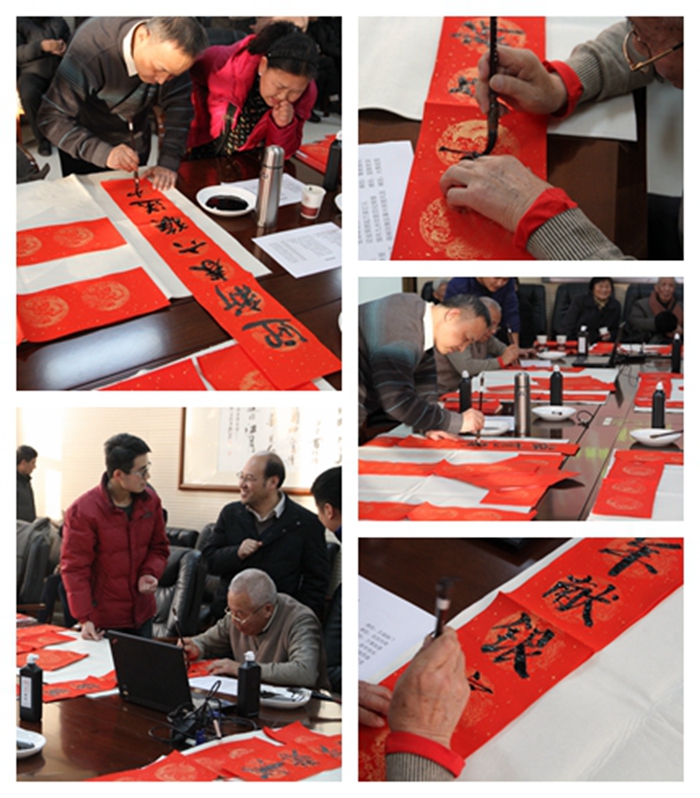 参观结束后,退休教师们为了表达对公司的祝福和对全院在职教工的勉励,还在1362会议室开展了“写春联·送祝福”活动。退休教师中的书法爱好者们现场挥毫泼墨,以饱满的热情创作出了一幅幅喜庆吉祥的春联,一个个苍劲灵动的书法字体落在喜气洋洋的红纸上,引得前来求取春联的在职教工们连连叫好,一副副带着浓浓墨香、饱含深深情谊、蕴藏美好祝愿的春联被大家争相领走。退休教师们顾不上休息,不停地挥舞手中毛笔为大家创作喜庆吉祥的春联,在职教师们也热心地为他们铺纸、添墨,大家都沉浸在祥和、愉悦的氛围之中。全体化学人将在这喜庆的新年气氛中继续保持旺盛的斗志和务实创新的作风,精诚团结,发奋工作,确保“十三五”建设开好局,为再续新的辉煌起好步!