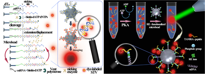 该研究团队近期还提出了一种全新的RNA FRET探针设计思路,适于多种核酸标志物的简单、灵敏检测;此外,利用多微球为荧光信号富集载体,结合信号放大策略的流式微球分析技术,实现了多核苷酸激酶活性的高灵敏度分析。上述研究结果均以封面文章的形式分别发表于Chem. Commun., 2015,51, 11556-11559 (Hot Article)和Chem. Commun., 2015,51, 5832-5835。