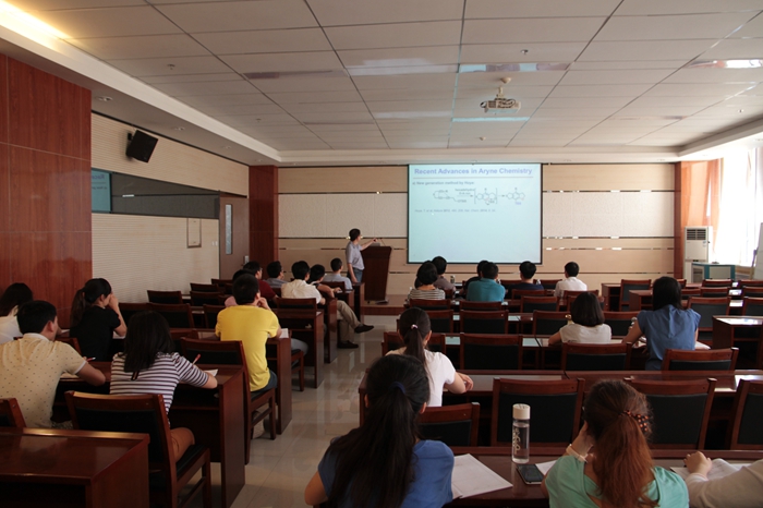 报告中,李杨教授用风趣幽默的语言向在场师生介绍了芳炔化合物的制备,反应性质、反应机理以及在有机合成中的应用。李杨老师的报告深入浅出、内容详实、逻辑性强,引起了与会师生的强烈共鸣。