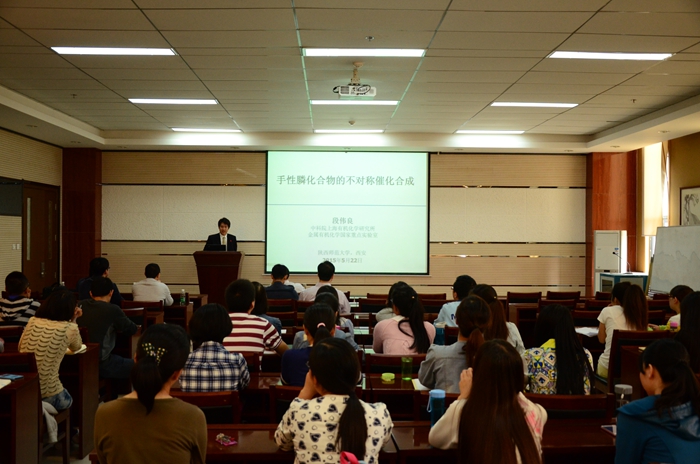 报告中,段伟良研究员用凝练简洁的语言向在场师生介绍了近年来其课题组在不对称催化合成手性膦,非导向C-H键活化,及手性膦酸参与的不对称C-H键活化所取得的进展和成果,并介绍了探索反应机理的方法。段老师将金属有机化学基元反应和催化体系的开发相结合,发展了一系列新的有用的催化方法。例如通过膦氢对α、β-不饱和烯酮等缺电子烯烃加成合成具有潜在应用可应用的手性含膦化合物。利用设计合成的双齿单负离子含氮配体实现了配体促进的无导向基团芳烃的碳氢键活化反应。以及发展了使用手性磷酰胺,磷酸实现脂肪族酰胺的不对称碳氢键活化反应,这一新的策略可为如何控制不对称碳氢键活化反应的立体选择性起到一定的启发和借鉴作用。段伟良研究员的报告深入浅出、内容丰富、逻辑性强,引起了与会师生的强烈共鸣。