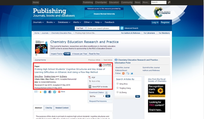 近日,公司化学教育与科学教育研究团队周青教授课题组相关研究取得突破性进展,相关工作以《Probing High School Students’ Cognitive Structures and Key Areas of Learning Difficulties on Ethanoic Acid Using a Flow Map Method》为题在英国皇家化学学会(Royal Society of Chemistry)所属杂志《Chemistry Education Research and Practice》(Impact Factor:1.309)在线发表。