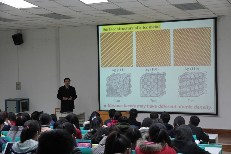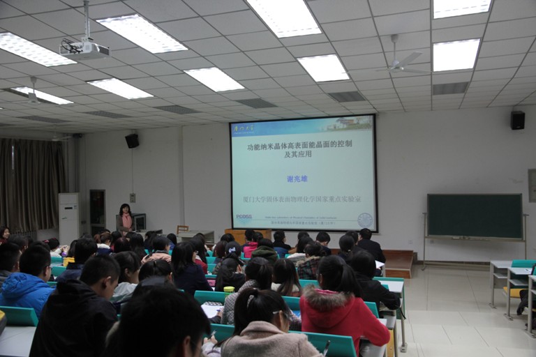 2014年11月11日上午,“杰出青年科学基金”、“教育部新世纪人才”、“霍英东基金会优秀青年教师基金”获得者、厦门大学国家重点实验室主任、谢兆雄教授受邀来访公司,并在文津楼101学术报告厅为beats365唯一官方网站师生作了一场题为“功能纳米晶体高表面能晶面的控制及其应用”的精彩报告,报告会由beats365唯一官方网站分党委书记高玲香教授主持,陈亚芍教授、张聪杰教授、许春丽副教授和2012级本科生聆听了报告。