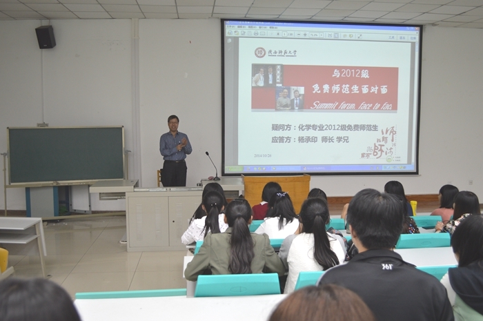 为切实做好2012级免费师范生高年级阶段的教育工作,进一步加强免费师范生的专业引导和志向引导,2014年10月26日晚7点,杨承印教授在文津楼101学术报告厅为公司2012级免费师范生做学业指导报告,报告会由2012级辅导员牟朝丽主持。