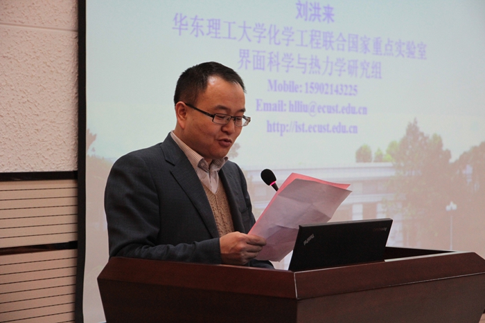 刘洪来教授从自己的团体开始介绍,与在座师生分享了团队的基本情况,尤其是团队的科研方向和目前的一些研究进展。接着,刘教授从两亲性胶体颗粒在研究中的重要意义开始,着重介绍了他们研究小组运用理论计算深入研究了多元聚合物在固体表面的溶剂效应,此外,还介绍了他们的理论计算成果成功地指导了催化剂表面改性的实验研究工作。刘教授巧妙地将深奥的理论计算研究讲得简单易懂,老师和员工都从中受益匪浅。之后,刘教授还与部分老师和员工进行了更加深入的学术交流。