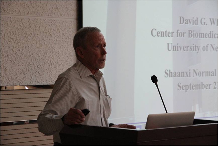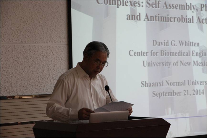 2014年9月24日上午,美国化学会Langmuir杂志主编、新墨西哥大学David Whitten教授应邀莅临best365英国在线体育官网,并在致知楼六层报告厅作了题为“Colloidal Assembly of Surfactant/Oligomer Complexes: Self Assembly, Photophysics and Antimicrobial Activity”的学术报告和题为“The Peer Review Process and Publication Ethics and Recent Developments in Scientific Publishing”的杂志介绍报告。报告由房喻教授主持。beats365唯一官方网站王增林教授、刘忠文教授、蒋育澄教授、江金强教授、杨鹏教授、蔡雪刁副教授、丁立平副教授、刘静副教授、彭军霞副教授等教师以及相关专业研究生和本科生聆听了报告。