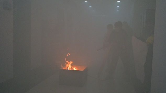 27日早上7:00开始,在致知楼一层南门通过二维码统计进入楼层所有人员数量,同时发放消防安全物资。9:15左右,在模拟火灾发生场景下,总指挥王长号发布应急疏散指令,各楼层点燃烟雾发生器和拉响警报信号,应急疏散环节迅即展开,各应急小组按照统一领导、综合协调、分级负责的应急处置原则迅速到达各自岗位,对照事故的发现与报告、应急指挥与协调、现场救援与疏散、事后检查与核查的演练流程,指挥师生员工打湿毛巾、捂住口鼻、低头弯腰、有序撤离。整个人员疏散过程演练用时4分40秒,共统计疏散人员886名。