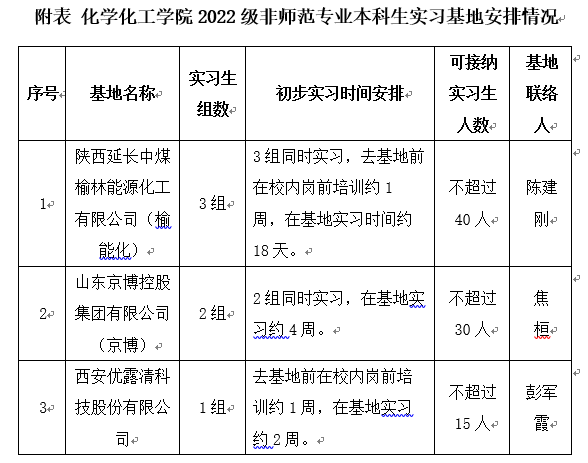 按照公司和公司相关文件规定,公司定于2025年7月中旬至2025年9月底开展2022级非师范专业本科生实习工作,实习单位为:陕西延长中煤榆林能源化工有限公司(榆能化)、山东京博控股集团有限公司(京博)和西安优露清科技股份有限公司(优露清),各基地组织框架和人员分配等见附表。