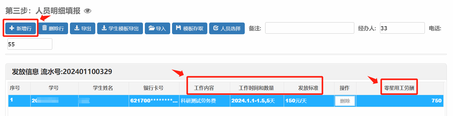 点击“新增行”可以输入学号调取人员信息,也可以点击“人员选择”进行检索。人数较多时可批量导入人员发放明细,批量导入时,先导出模板,在导出的EXCLE中整理好人员信息,再进行批量导入。
