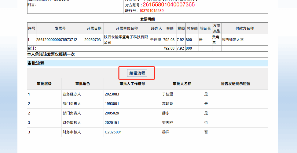 (6)线上审批时,系统会展示默认审批人员,点击编辑流程,可以对相关审批人员进行新增、更换、删除,实现指定人员审批的目的。注意每一个审批级次需要保留一个审批人。方法和原则与“收入申报”相同,不再赘述。