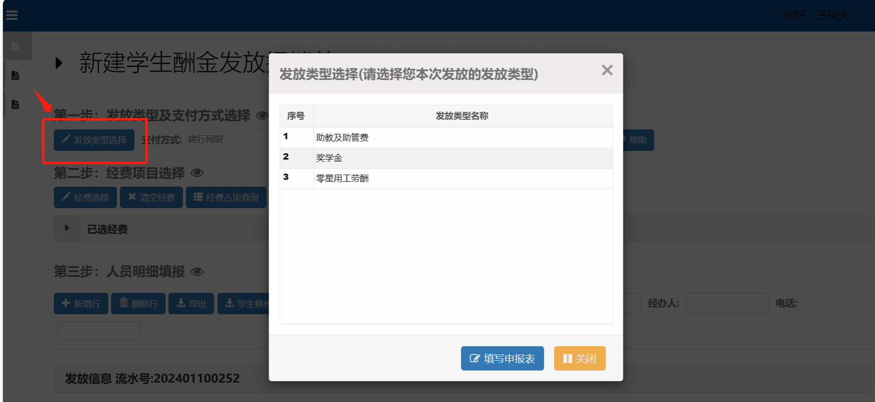 (1)经办人(必须是老师账号)新建员工酬金发放单,选择发放类型,双击选择需要的发放类型
