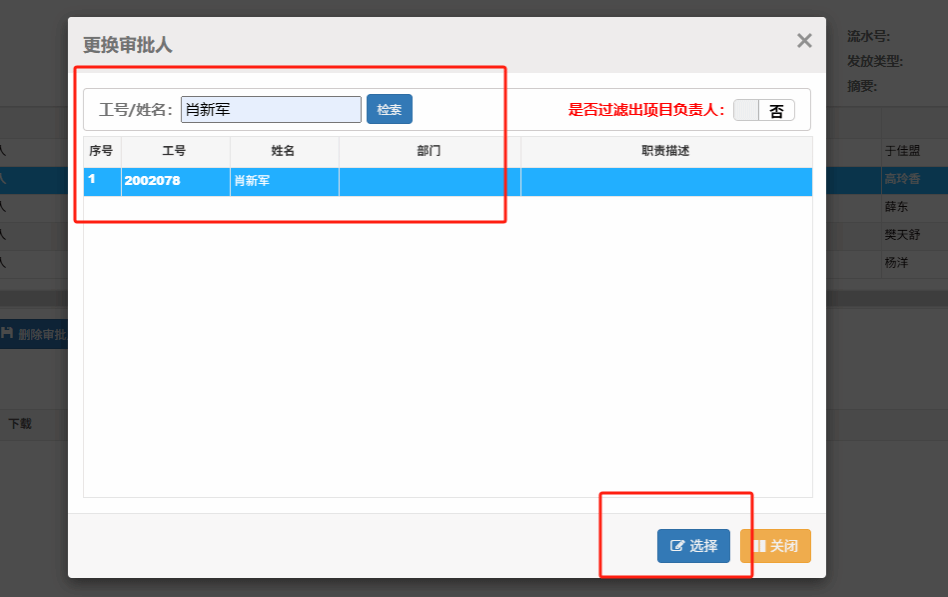 ①经办人和审批人不能是同一人。当经办人是项目负责人时,需先选中项目负责人/部门负责人,再点击更换审批人。12开头的经费(科研类经费)及130103开头的经费(基本科研业务费)可选择项目其他老师审批,其他经费选择肖新军副经理(工号:2002078)进行审批。