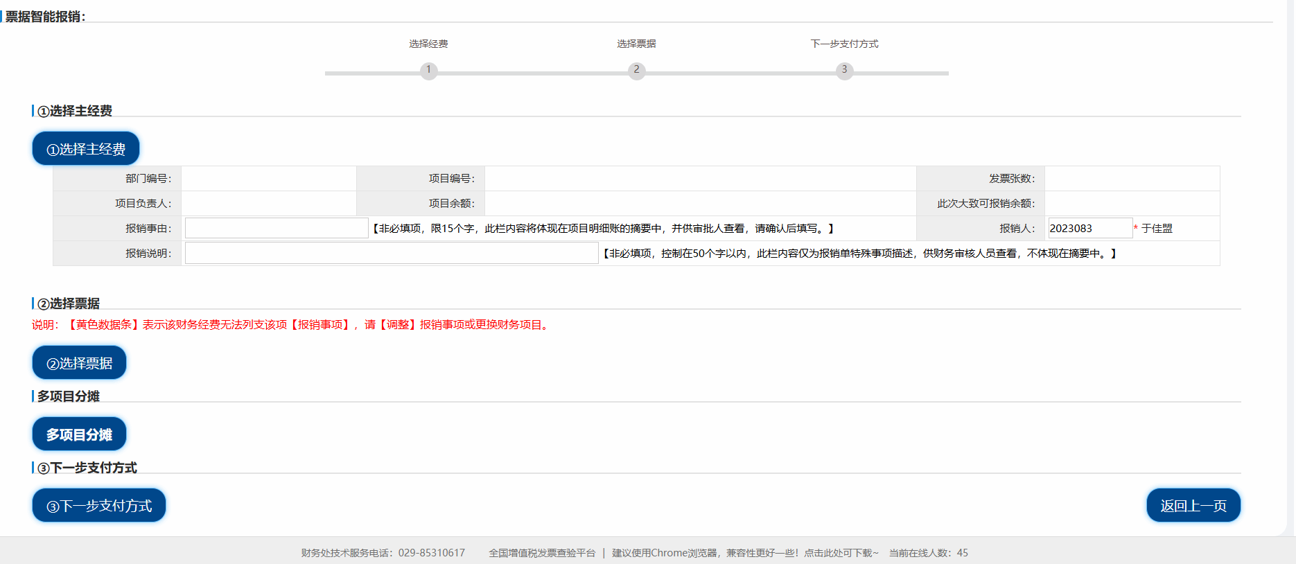 (3)选择主经费后填写报销事由,点击选择票据后上传电子发票,识别后注意勾选。