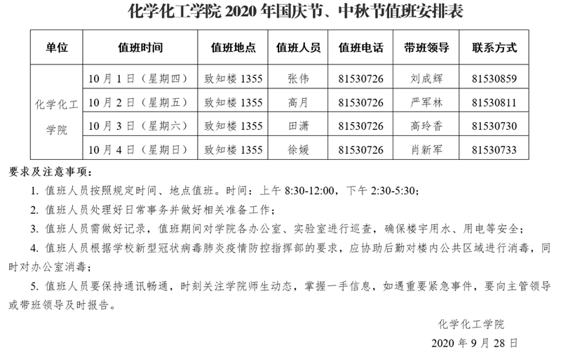 beats365唯一官方网站2020年国庆节、中秋节值班安排表