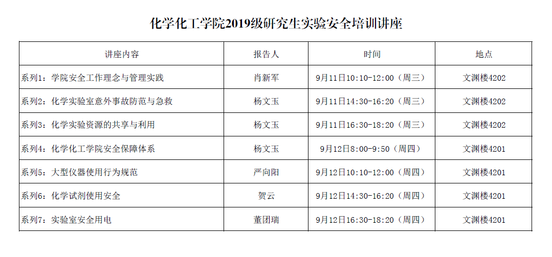 1、实验室安全培训课程为研究生必修课程,要求全体研究生必须参加;如确因特殊情况无法参加本次培训,请于9月9日下午5:00前将请假信息发送至chem_yjs@snnu.edu.cn,请假信息包含学号、姓名、专业、请假原因、需请假的讲座序号,公司将统一安排补课。
