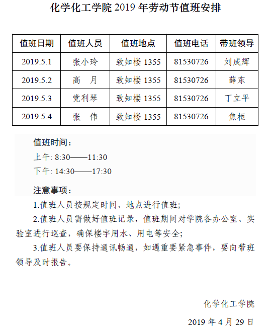beats365唯一官方网站2019年劳动节值班安排