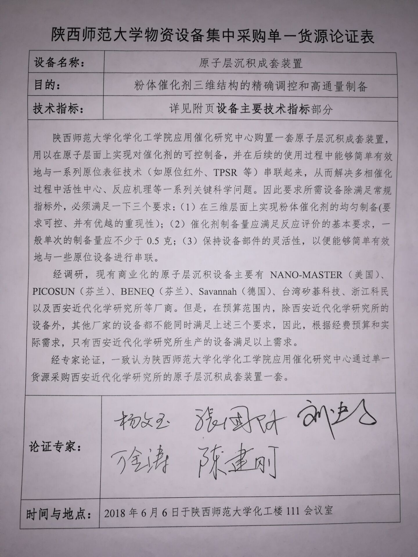 经调研,现有商业化的原子层沉积设备主要有NANO-MASTER(美国)、PICOSUN(芬兰)、BENEQ(芬兰)、Savannah(德国)、台湾矽碁科技、浙江科民以及西安近代化学研究所等厂商。但是,在预算范围内,除西安近代化学研究所的设备外,其他厂家的设备都不能同时满足上述三个要求。经专家论证,一致认为best365英国在线体育官网应用催化研究中心通过单一货源采购西安近代化学研究所的原子层沉积成套装置一套。