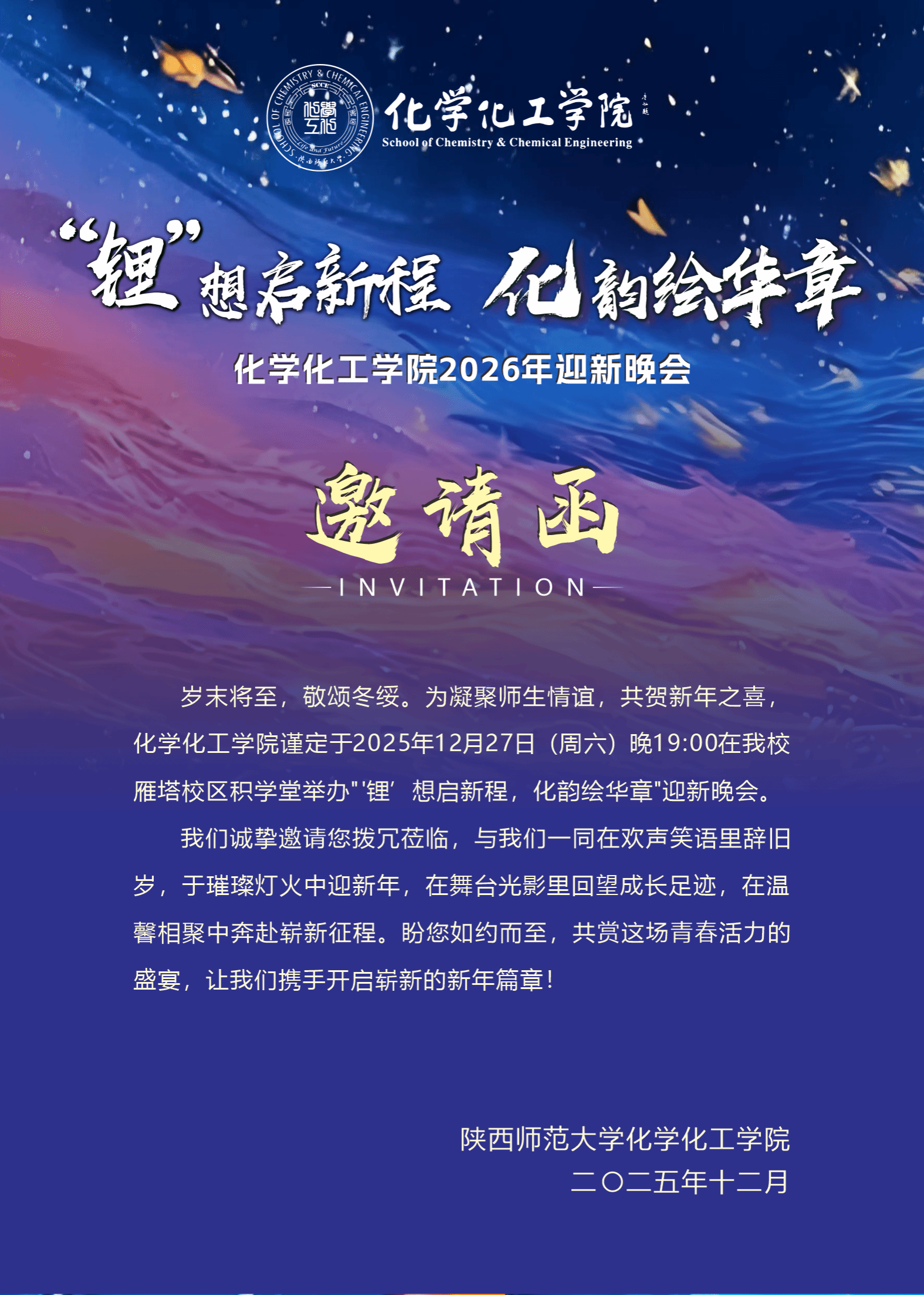 为凝聚师生情谊,共贺新年之喜,公司特举办2026年“‘锂’想启新程,化韵绘华章”迎新晚会。现将有关事宜通知如下: