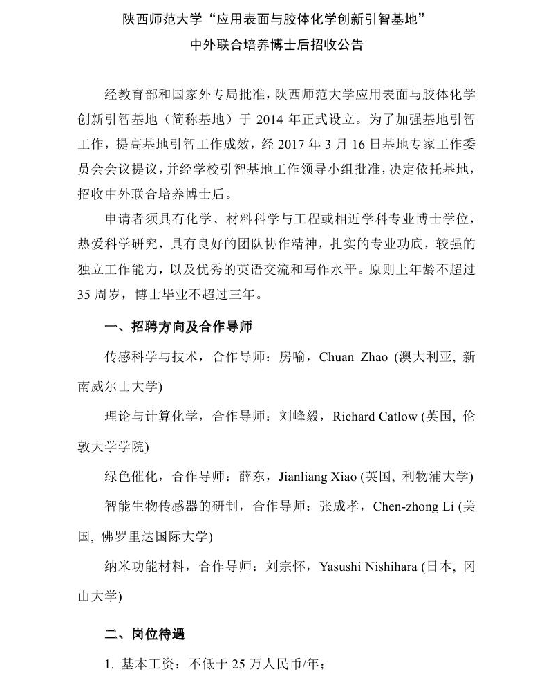 BEAT365英国官网网站“应用表面与胶体化学创新引智基地”中外联合培养博士后招收公告
