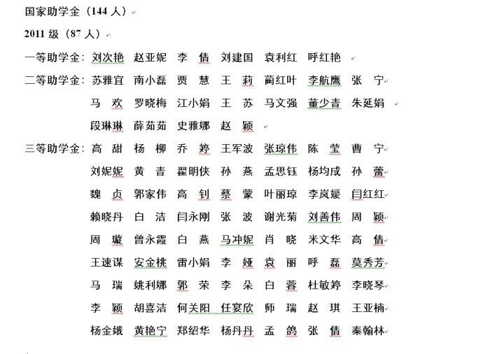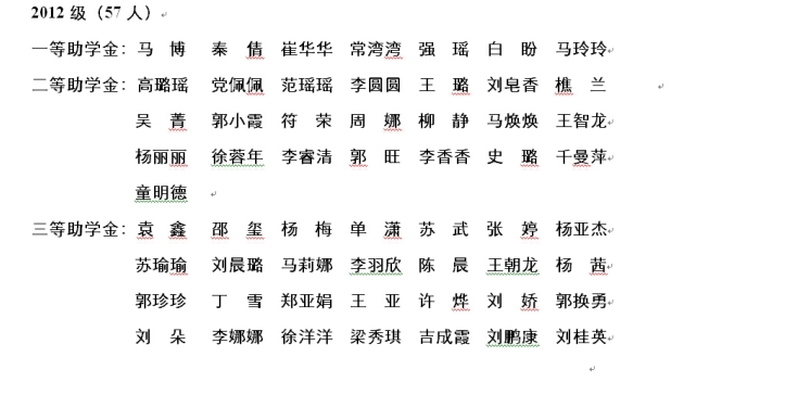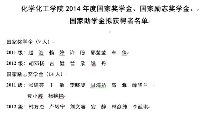 根据国家奖学金、国家励志奖学金、国家助学金的评选办法,结合员工处《关于开展国家奖学金、国家励志奖学金和国家助学金评选工作的通知》精神,经员工本人申请,班级评议,公司评审领导小组审核,现将公司2014年国家奖学金、国家励志奖学金、国家助学金拟获得者名单公示如下。公示期三天,具体时间为2014年10月1日至10月3日。公示期间,若对获奖、获助人员存在异议,请于2014年10月3日下午五点半前通过面谈、电话、短信或邮件方式及时向王启明副书记反映。