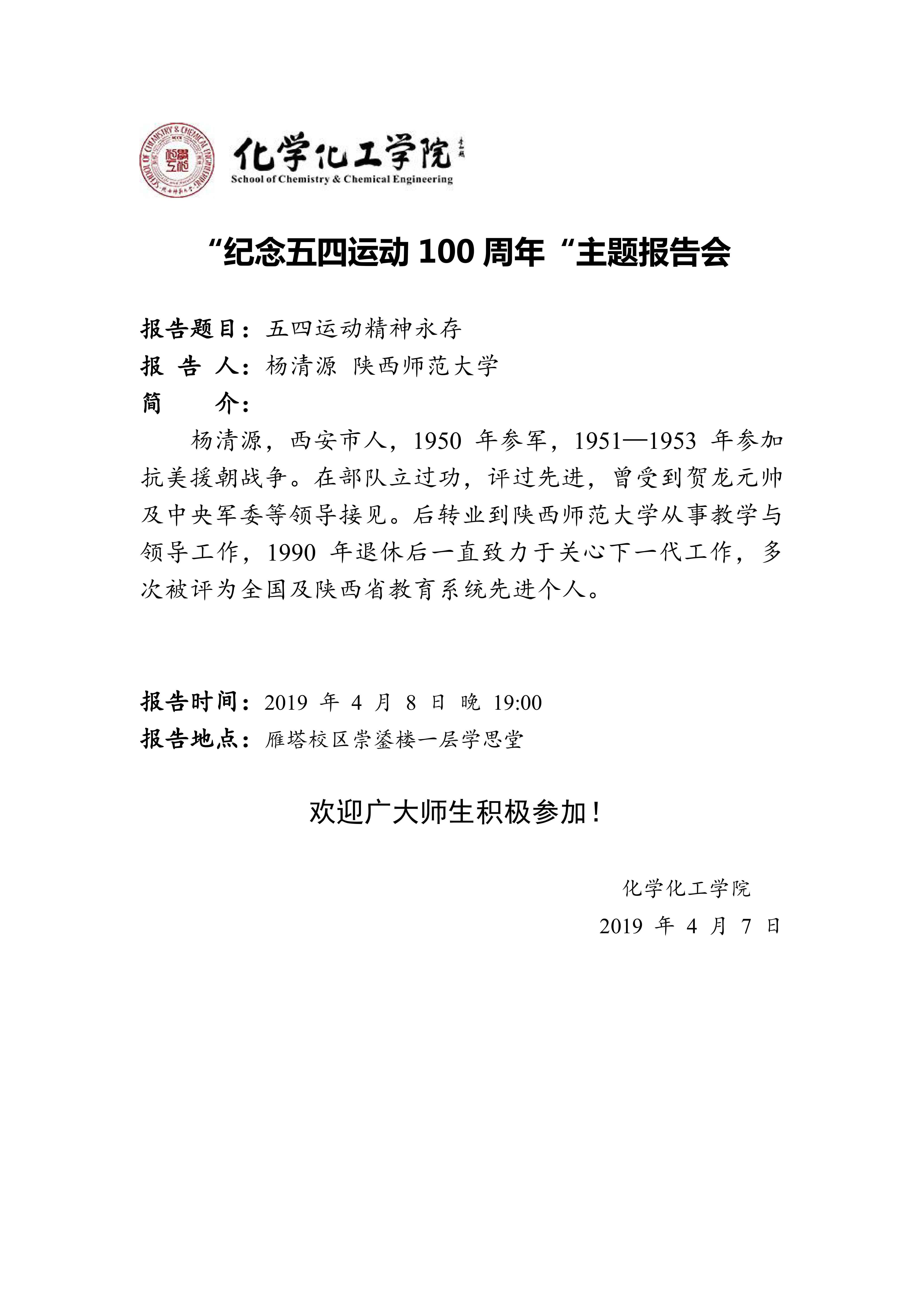 “纪念五四运动100周年“主题报告会