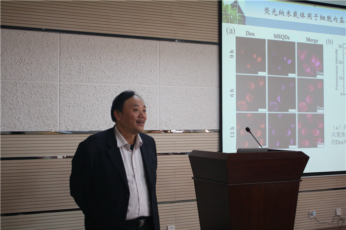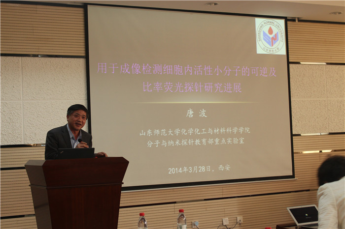 2014年3月28日下午,山东师范大学党委常委、副董事长,973首席科学家,国家杰出青年科学基金获得者,“新世纪百千万人才工程”国家级人选,“泰山学者攀登计划”学者,国家自然科学基金委员会第12、13届专家组成员唐波教授,在公司六层报告厅做了题为“用于成像检测细胞内活性小分子的可逆及比率荧光探针研究进展”的学术报告。唐波教授介绍了生物活性小分子的生物学功能及特点,展示了该研究组在荧光成像法、可逆荧光成像和比率荧光成像研究中取得的成果。