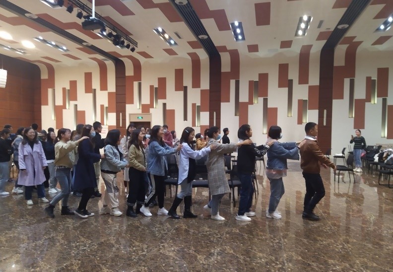 在欢快的音乐中,20级新生通过手拉手和大圆圈的形式,拉近了彼此之间的距离,使同学们迅速融入活动之中;多次报数和小跑游戏,同学们相互认识彼此,“我是.......、我能.......、我会.......、”描述和开火车游戏,把全场气氛活跃起来;最后“蜗牛与黄鹂鸟”的大合跳,给团体辅导活动来一个美好的结尾。