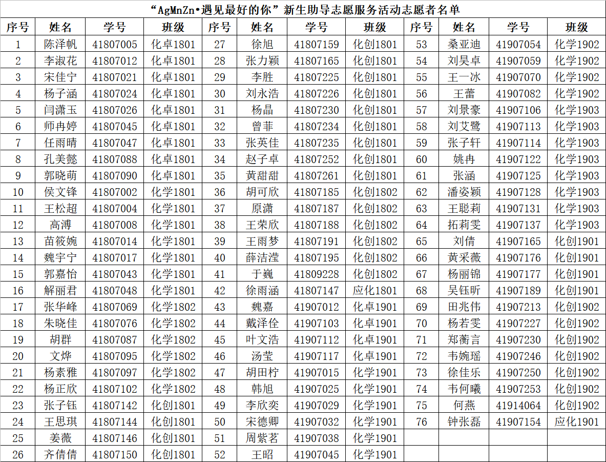 根据《关于公开招募beats365唯一官方网站“AgMnZn•遇见最好的你”新生助导活动志愿者的通知》要求,按照beats365唯一官方网站“AgMnZn·遇见最好的你”新生助导活动志愿者招募条件,通过公开招募、自愿报名、择优录取,拟定陈泽帆等76名同学为活动志愿者,现予以公示。