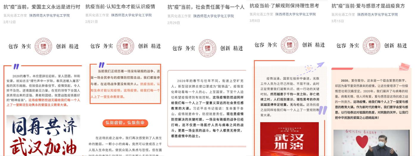 疫情初期,公司团委推出“抗疫当前”系列推文,通过“爱国主义永远是进行时”、“认识生命才能认识疫情”、“社会责任属于每一个人”、“了解规则保持理性思考”、“爱与感恩才是战疫良方”五篇文章,把疫情和灾难变成教材,从正面引导员工以良好的心态,正确认识疫情,抗击疫情,从我做起。疫情期间,指导公司26个本科生团支部积极开展“青春凝聚力量,携手共抗疫情”线上主题团日活动,1128名团员青年通过多种方式,向抗疫一线人员致敬、向积极参与抗疫的青春榜样学习、向克服种种困难“停课不停学”的师生看齐。