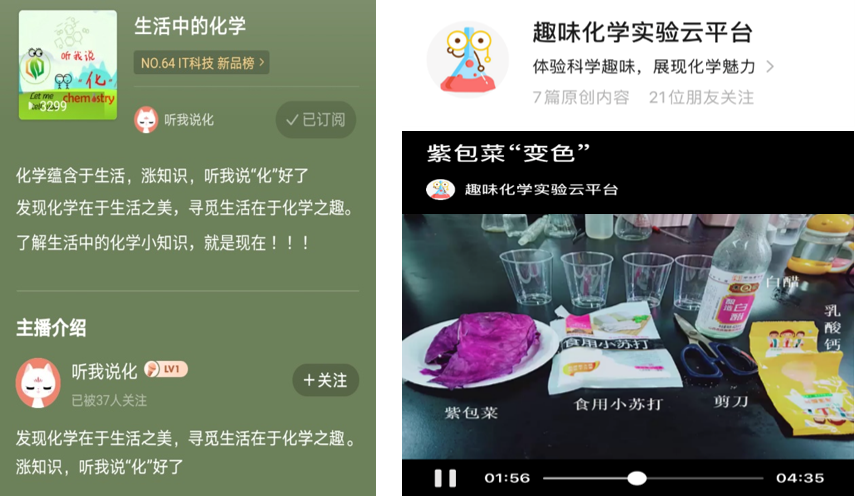公司团委积极发挥新媒体宣传优势,通过喜马拉雅音频分享平台开设“听我说化”栏目;指导趣味化学实验团队成员将趣味化学实验内容剪辑成系列公开科普视频,建立了趣味化学实验云平台,不间断传播化学正能量。