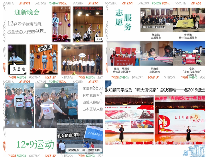 学风建设方面,各班“查课堂、查寝室、查自习”制度蔚然成风,此外积极开展“教授接待日”活动、英语话剧比赛、三笔字练习打卡、“西部红烛”养成计划,多方面综合推进班级同学素质提升;