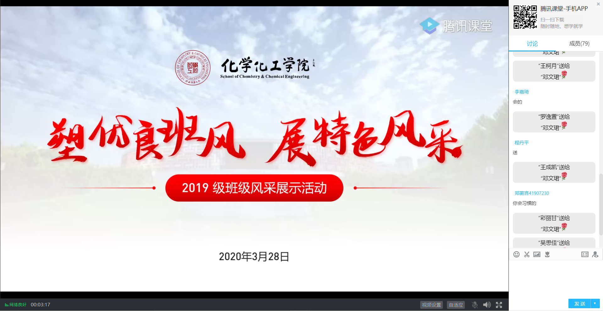 细细的网线传送着浓浓的情谊,同学们在评论区中畅所欲言,化学1902班班长刘昊卓谈到:“班级的荣誉离不开每一位同学的努力,每个人都是不可或缺的存在。”化学类1901班班长苏敏向全班同学表白:“不是在最好的时光中遇见你们,而是遇见了你们才拥有最美好的时光。”