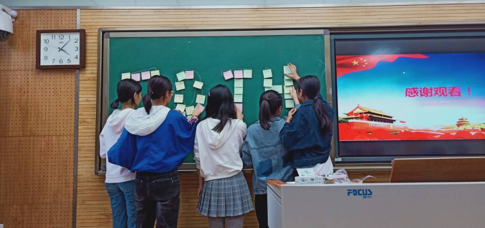然后,团支书为同学们介绍建国以来,祖国经历的峥嵘岁月和祖国飞速发展的历史。活动过程中根据介绍的历史进行分小组知识竞赛,请同学们进行作答,同学们主动活跃的抢答问题,表现非常出色。最后下发便利贴,让每位同学写下对祖国的祝福。同学们积极地将写好的便利贴在黑板上贴成七十的形状,表达同学们对祖国的美好祝愿。