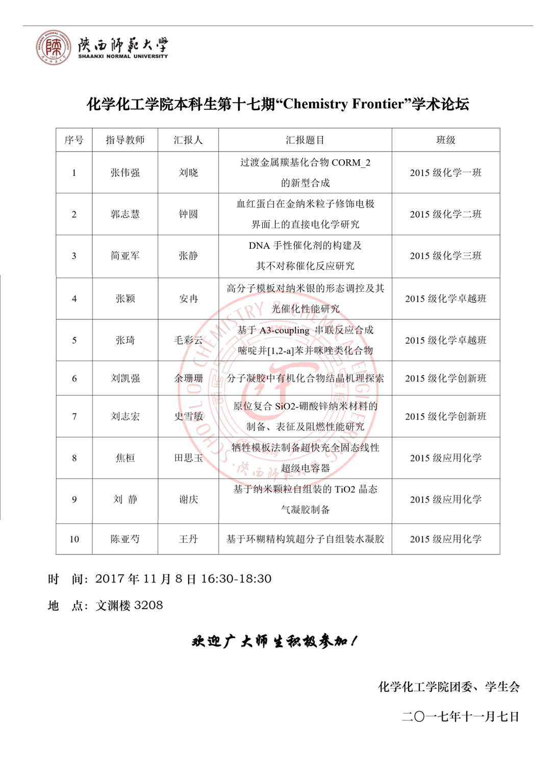 【通知】beats365唯一官方网站第十七期本科生“Chemistry Frontier”学术论坛