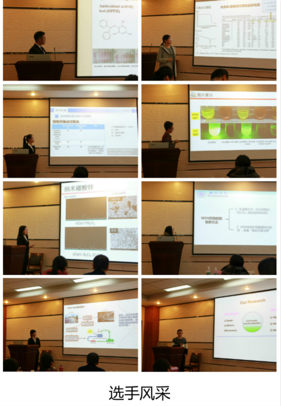 开幕式后,来自公司2015级笃学班的4组本科生科研团队和西北大学化学与材料科学公司的4组本科生科研团队进行交流。8组选手依次展开报告:来自公司的牛子儒同学(团队成员王丹、李茜、高进和刘睿琪),采用英文PPT向大家介绍了他的项目—基于环糊精构筑超分子自组装水凝胶;田思玉同学为大家介绍了牺牲模板法制备超快充全固态线性超级电容器;史雪敏同学(团队成员有王照娟、王希妍和任星)的项目是原位复合SiO2-硼酸锌纳米材料的制备、表征及阻燃性能研究;林思敏同学介绍了Au/MoS2/TiO2核-壳结构复合材料的制备及其在光催化水分解产氢中的应用。来自西北大学的张雨彤同学(团队成员有田亚茹和安尚洁),介绍了三唑类高能有机金属框架(HE-MOFS)的合成、结构及理化性质的研究;彭嘉鑫同学(团队成员有田亚茹和安尚洁)介绍了有机金属笼状化合物的主客体化学研究;党倩同学(团队成员贾岚欣)介绍了介孔二氧化硅纳米药物的制备新方法研究;任江涛同学(团队成员谢虎)介绍了Regioselective C-H Bond Functionalization。每一个团队汇报人不仅介绍了项目研究背景、主要创新点及研究内容,还分享了参与科研的收获和感悟,并与老师进行了现场的交流和探讨。