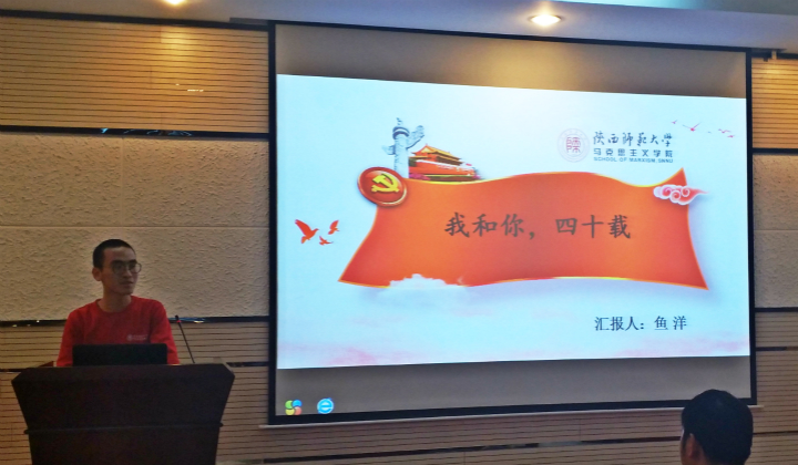 紧接着鱼洋同学也提出了“新时代,我与你同行!”的新时代宣言,向我们发表了他对于“我和你,四十载”的看法以及和大家一起交流讨论对此的理解。在新时代,一个青年更应该注意自己的综合发展,要树立远大志向,用自己的努力切实践行社会主义核心价值观,为实现伟大中国梦而不断奋斗。