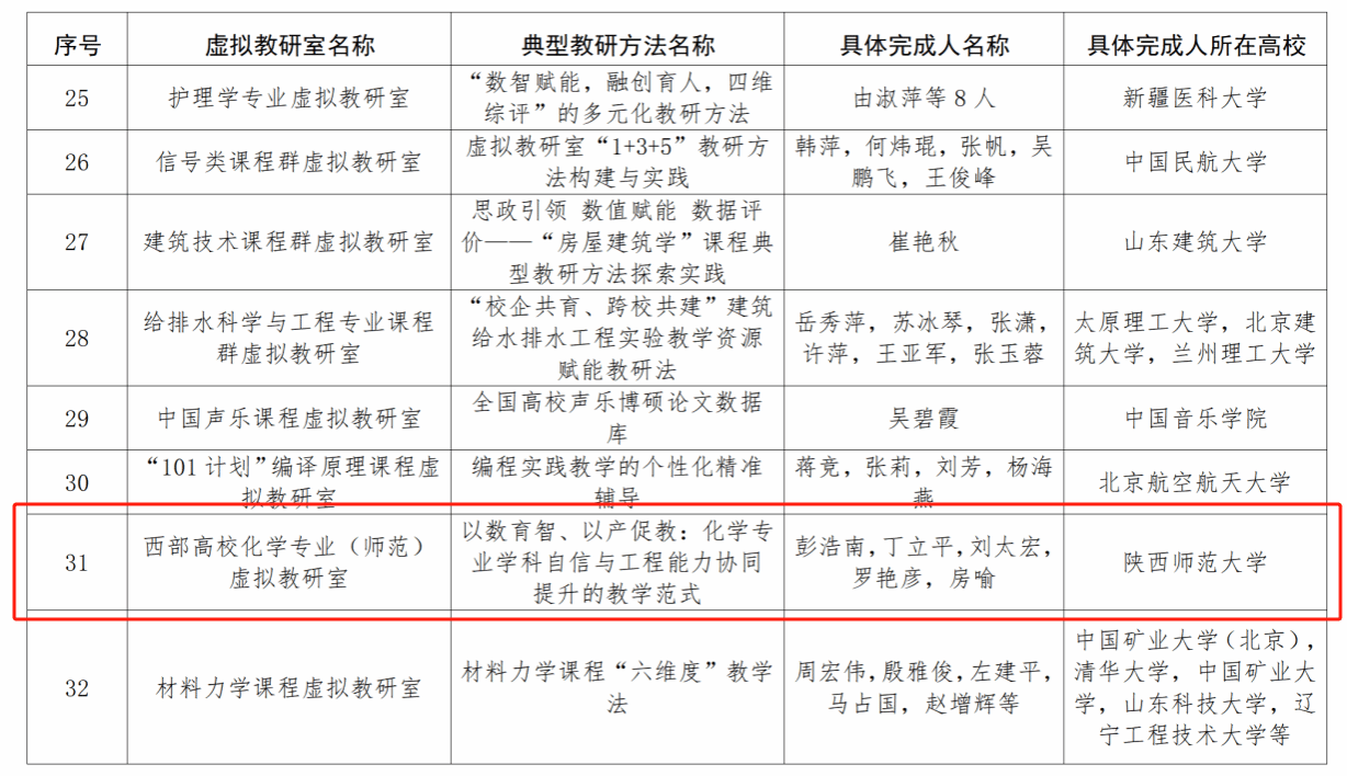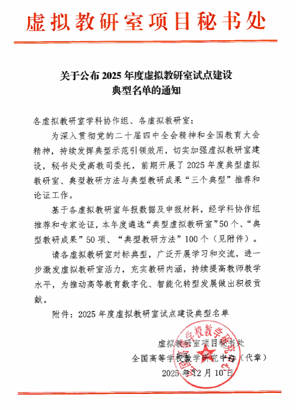 为深入贯彻党的二十届四中全会精神和全国教育大会精神,持续发挥典型示范引领效用,切实加强虚拟教研室建设,全国高等公司教学研究中心受高教司委托,组织开展了2025年度典型虚拟教研室、典型教研方法与典型教研成果“三个典型”评选工作。经过学科协作组推荐和专题工作组专家论证,由房喻院士担任负责人的公司国家级“西部高校化学专业(师范)虚拟教研室”报送的“以数育智、以产促教:化学专业学科自信与工程能力协同提升的教学范式”(主要完成人:彭浩南、丁立平、刘太宏、罗艳彦、房喻),荣获2025年度典型教研方法。