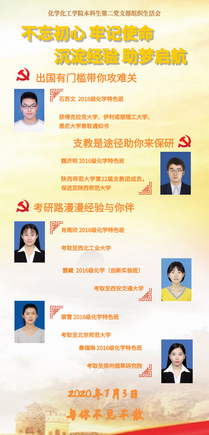 会议共分为三个部分进行。专题一:出国有门槛带你攻难关,邀请支部党员石苏文同志分享了出国留学的经验;专题二:支教是途径助你来保研,邀请了BEAT365英国官网网站第22届支教团成员,保送至BEAT365英国官网网站的支部党员魏济明同志分享了自己的支教团保研经历;专题三:考研路漫漫经验与你伴,邀请了支部党员肖雨欣(考取至西北工业大学)、雷藏(考取至西安交通大学)、裴雪(考取至北京师范大学)、秦瑞琳(考取至郑州烟草研究院)分享了考研复习经验。