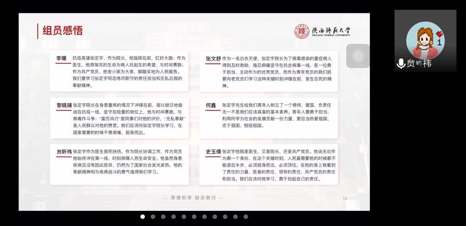 本次学习采用分组讨论的方式,41位党员分为七组,共学习了钟南山、杜富佳、蒋文强、刘智明、彭银华、张定宇、李文亮七位抗疫英雄的故事。每个小组通过材料收集、qq群讨论以及视频会议的方式进行了前期准备,以PPT的形式在党日活动中组织支部全体党员进行了学习。