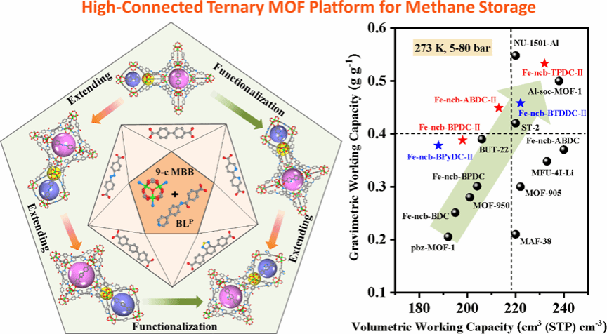 设计合成兼具高质量比和体积比甲烷存储工作能力的单一MOF材料对于推动天然气用于车辆运输具有重要的意义,但是具有很大的挑战性。这是由于单一多孔材料的质量比和体积比甲烷总吸附量之间存在着trade-off效应。近期,BEAT365英国官网网站新概念传感器与分子材料研究院通过一个九连接的三基元MOF平台实现了质量比和体积比甲烷存储工作能力同高的材料(图1)。
