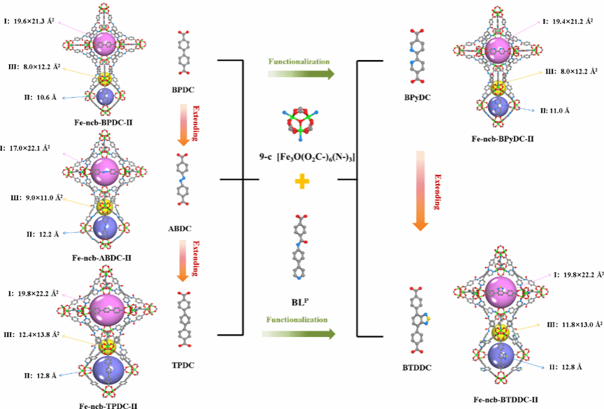 前期的研究表明,高连接三基元MOF结构在同网络扩展时,晶体密度往往下降缓慢,材料的质量比表面积和体积比表面积往往都高,有望获取质量比和体积比总甲烷吸附量同高的多孔材料(ACS Appl. Mater. Interfaces 2021, 13, 44956)。在这里,通过合成一个全新的吡啶-羧酸配体,联合三核铁簇及其系列不同长度或功能化的二羧酸配体,使用双溶剂体系和双调制剂的溶剂热原理,我们成功构建了一个九连接三基元MOF平台。通过单晶X射线衍射技术,对制备的五个MOF材料的结构进行了解析。结果表明,均为ncb型拓扑网络,含有笼子-通道双孔多级孔结构,且不含开放金属位点(图2)。