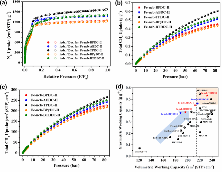 结合多步溶剂交换以及超临界二氧化碳活化策略,该系列材料均得到了成功活化,获得了可观的多孔性。其中孔体积在1.90 cm³ g⁻¹以上,质量比表面积超过4800 m² g⁻¹,体积比表面积也大于1600 m² cm⁻³。80巴高压甲烷吸附性能测试表明,系列材料呈现较高的总质量比和体积比甲烷吸附能力。特别地,当测试温度降低至273K,这些材料的总质量比和体积比甲烷吸附量增加显著。其中,通过最长二羧酸连接体构筑的Fe-ncb-TPDC-II,其质量比和体积比甲烷存储工作能力分别达到0.533 g g-1,232 cm3 (STP) cm-3,在相似条件下报道的多孔材料中表现非常突出(图3)。该研究为制备高效天然气存储材料提供了新的思路。