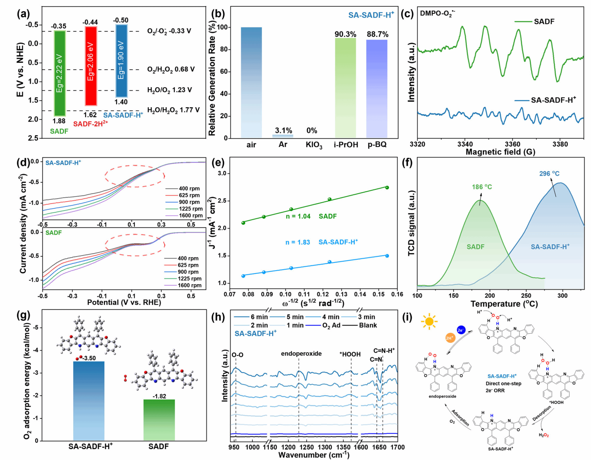 为了更详细地阐明光催化产H2O2的机理,我们进行了能带结构表征、自由基捕获实验、电子顺磁共振、旋转圆盘电极/旋转环盘电极测试、O2程序升温脱附、原位漫反射红外傅立叶变换光谱等实验和表征(图5b-5h)。研究结果表明:与原始的SADF不同,非对称质子化引起的电荷分布改变为Yeager型O2吸附创造了大量双活性位点,从而使得SA-SADF-H+实现一步两步电子ORR途径,抑制了超氧自由基阴离子的生成(·O2-)的生成,实现高效光催化产过氧化氢。