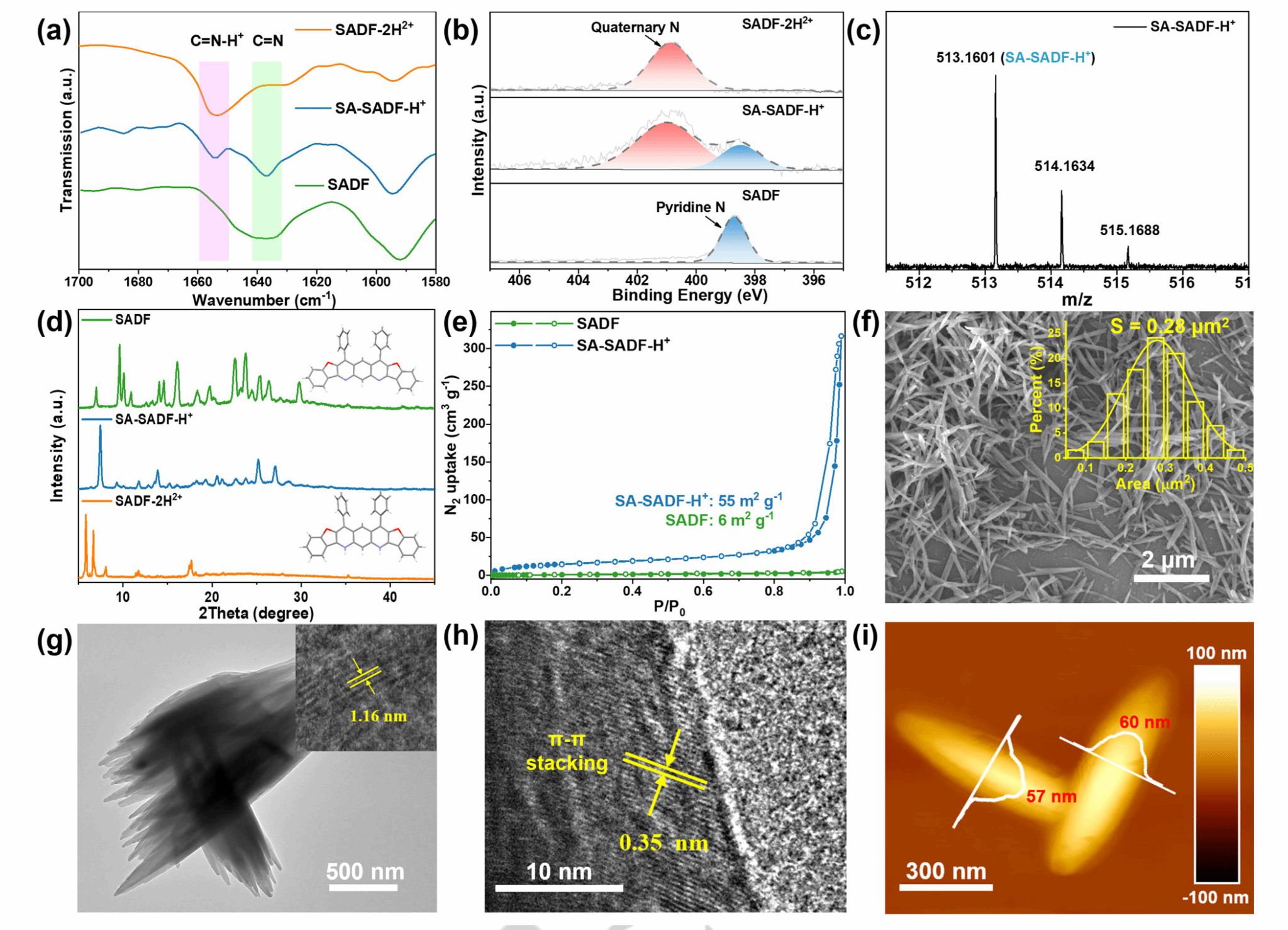 本文非对称质子化驱动超分子自组装方法制备了具有梭形结构的非对称质子化超分子光催化剂SA-SADF-H+(图 1f-1i)。红外光谱、XPS、以及高分辨质谱表明SA-DADK-H+非对称质子化的结构(图1a-图1c),XRD图谱表明催化剂具有优良的结晶性,有利于载流子的高效迁移(图1d)。非对称质子化大幅增加了光催化剂的比表面积,也为光催化提供了大量活性位点(图1e)。