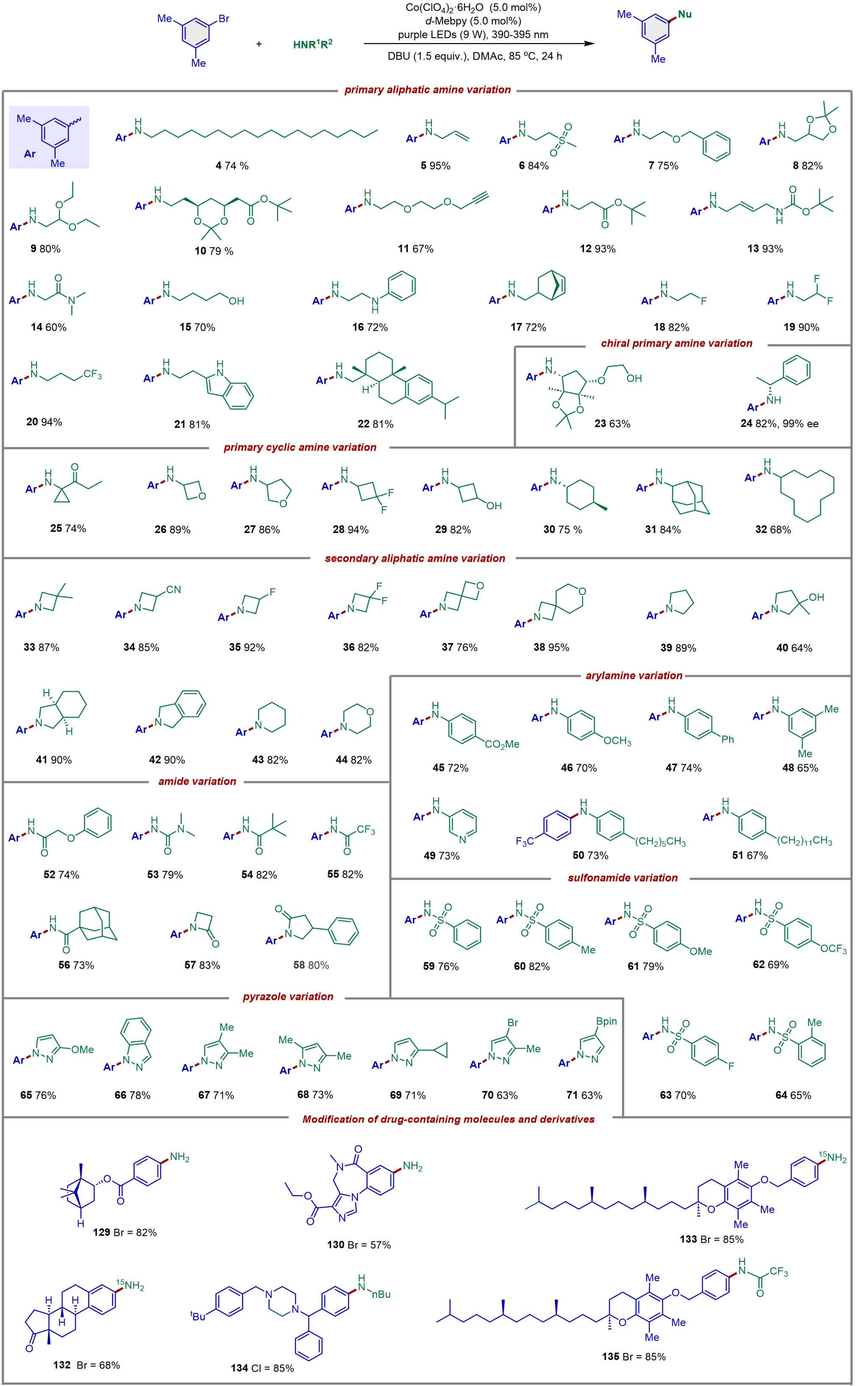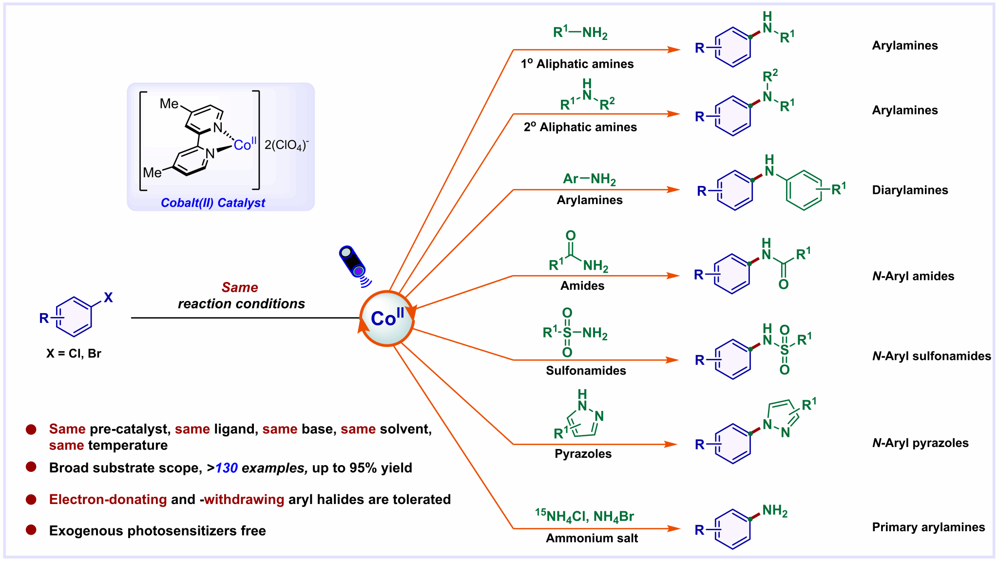 过渡金属催化的C-N偶联反应为芳胺及其衍生物的合成提供了重要方法,已成为药物合成领域最常用的20个反应之一。然而,默克公司(Merck)的研究表明:基于∼10000个实例的数据分析,C-N偶联反应的失败率仍然高达 35%。究其原因,目前广泛使用的过渡金属催化剂体系在很大程度上依赖于各种特定配体、前催化剂的设计、合成,以及针对不同类型的含氮底物开展的催化剂筛选和反应条件的逐一优化,导致缺乏通用性C−N偶联反应催化剂体系。为突破这一瓶颈,基于机器学习、人工智能与高通量实验(HTE)结合筛选反应条件的策略近年来得到了快速发展。考虑到C-N 偶联反应在合成化学中的重要性,开发通用性 C-N 偶联催化剂新体系(使用相同的前催化剂、配体、溶剂、碱和温度)为C-N偶联反应的发展提供了新的策略。钴(Co)是一种低毒且储量丰富的金属,由于其高的催化活性,钴催化剂被视为贵金属催化剂的理想替代品。Co催化剂在C-C键交叉偶联反应领域已经得到了广泛的应用,但是在构筑C-N键方面的应用还十分有限。BEAT365英国官网网站薛东课题组基于前期的研究基础 (Angew. Chem. Int. Ed. 2021, 60, 5230; Angew. Chem. Int. Ed. 2021, 60, 21536; ACS Catal. 2022, 12, 15590; ACS Catal. 2024, 14, 4968; Angew. Chem. Int. Ed. 2024, 63, e202314355),发展了基于钴催化剂的高效、自适应光化学 C-N 偶联反应新体系。该体系使用相同的钴源和配体,在相同的反应条件下(溶剂、碱和温度),无需外源光敏剂,实现了芳基卤化物与七种不同类型含氮亲核试剂(脂肪胺、芳胺、酰胺、磺酰胺、吡唑、铵盐)的C-N偶联(图1)。该光化学胺化反应中,单一钴催化剂发挥了双重作用:作为光敏剂吸收光和作为催化剂构筑C-N键。反应表现出优异的官能团耐受性,能够兼容挑战性的富电子芳基卤化物和邻位位阻的芳基卤化物,并实现了在药物分子合成中的应用(图2)。这项工作为发展通用性C-N偶联反应催化剂体系提供了新思路。