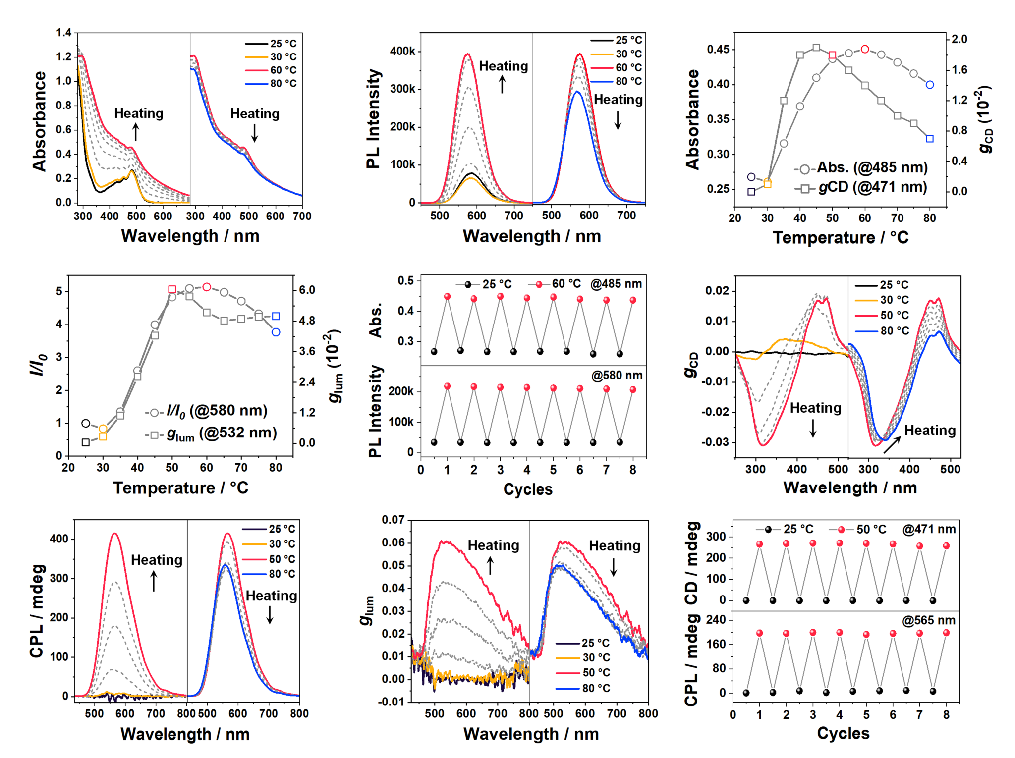 分子组装是提升有机小分子圆偏振发光(Circularly Polarized Luminescence, CPL)不对称性的有效手段,也是CPL领域的重要发展方向之一。然而,传统的焓驱动自组装为放热过程,升温会导致组装体解聚,显著削弱CPL材料的发光性质。如何同时提升CPL材料的圆偏振发光不对称因子(glum)和发光效率(QY),并克服热淬灭现象,是该领域的关键科学问题。