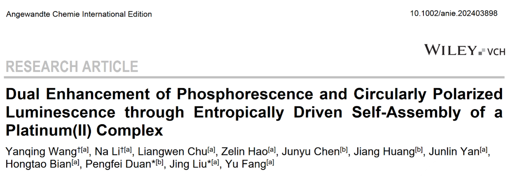 相关工作以“Dual Enhancement of Phosphorescence and Circularly Polarized Luminescence through Entropically Driven Self-Assembly of a Platinum(II) Complex ”为题发表在Angew. Chem. Int. Ed.上,硕士研究生王彦清和李娜第一作者,BEAT365英国官网网站刘静教授,国家纳米科学中心段鹏飞研究员为通讯作者。