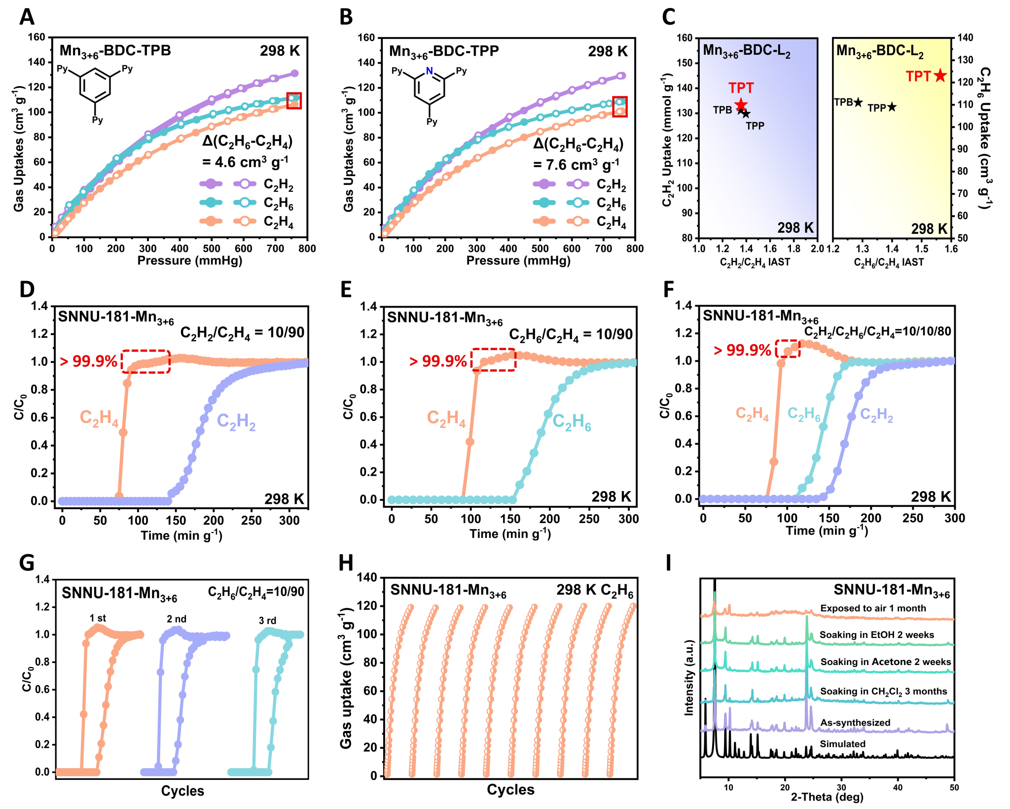 进一步使用含不同N原子数目的分区体构筑了系列Mn3+6-BDC-L2 pacs MOFs,实验结果表明(图3A-C),Mn3+6-BDC-TPT(每个TPT中含有3个未配位的N原子)最具吸附分离潜力,证明了精细优化N位点可有效提升材料的吸附分离性能。动态穿透实验表明,SNNU-181-Mn3+6可高效分离C2H2/C2H6/C2H4(10/10/80,v/v/v)三元混合气体(图3F)并提供出色的C2H4产率(1.77 mmol g-1),比得上许多已报道的基准C2H2/C2H6选择性MOFs。循环测试和稳定性测试证明了SNNU-181-Mn3+6的可循环性和稳定性(图3G-I)。