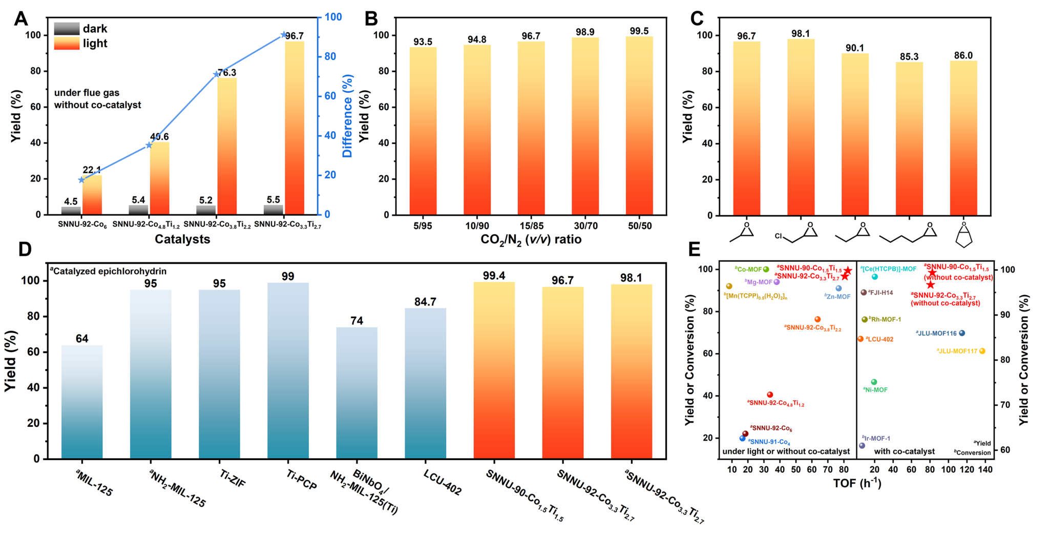 基于理论数据和实验结果,作者提出了SNNU-92-Co6-xTix MOFs的催化机理(图7)。首先,烟道气中的CO2优先吸附在SNNU-92-Co6-xTix MOFs中的金属簇附近。在光照条件下,NTB3-产生的光生电子通过配体到金属的电荷转移(LMCT)途径转移到金属簇上,*NTB3-随后吸附环氧化物。然后,Ti(IV)促进了反应中CO2的活化和电荷利用,*CO2攻击环氧化物的弱侧碳进而开环。最后,整个环加成反应随着框架中电子的重组和环的闭合而完成。