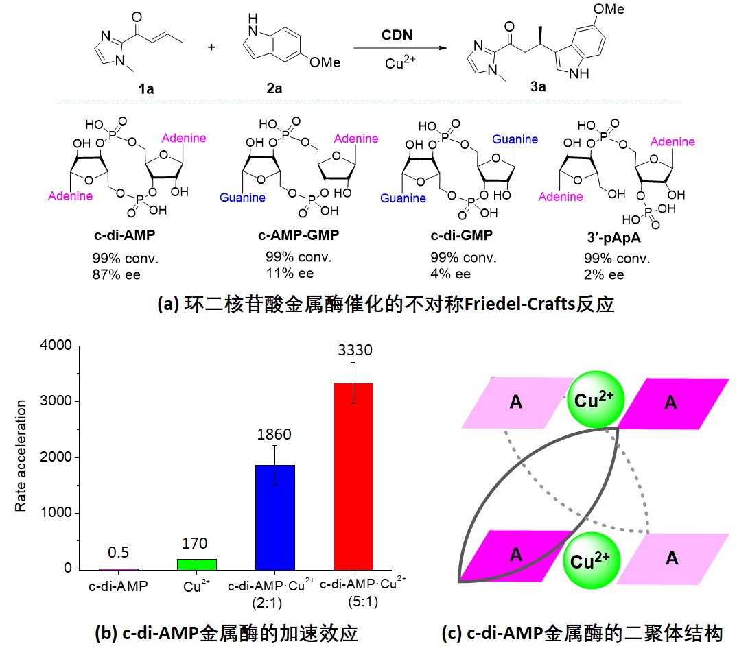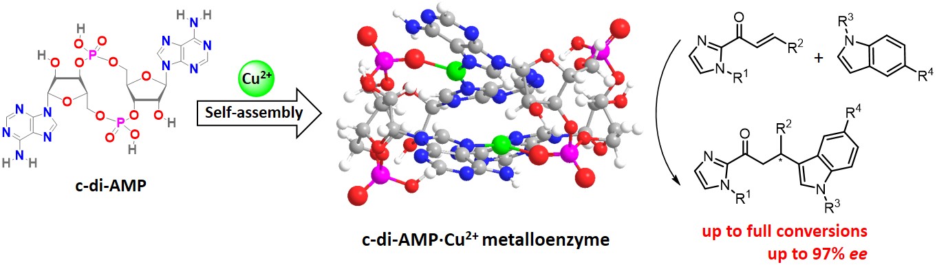 近日,公司王长号副教授、陈亚芍教授和德国康斯坦茨大学Jörg S. Hartig教授、中科院大连化物所李灿院士合作发现一种环二核苷酸c-di-AMP和铜离子自组装形成稳定的人工RNA金属酶,对水相中的不对称Friedel-Crafts反应表现出优异的手性催化性能。