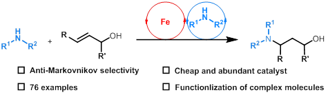 氢胺化反应是将烯烃、炔烃等基本化工原料转化为高附加值胺类化合物的一类重要转化过程。由于氢胺化反应可以生成马氏和反马氏两种产物,氢胺化反应中的化学选择性控制一直是该反应中的一大难题。课题组基于氢转移的策略,发展了基于廉价铁催化的烯丙醇反马氏氢胺化和氢酰胺化反应,实现了系列γ-氨基醇类化合物的绿色合成。该催化体系具有高反马氏选择性、反应条件温和、底物范围广泛、官能团耐受性好等优点;且反应中手性底物的立体构型在产物中能得到保持,可以有效的对手性氨基酸,天然产物和药物分子等复杂分子进行修饰。机理研究表明,反应通过两个协同的催化循环进行,即Fe-PNP络合物催化脱氢/氢化过程和胺底物作为有机催化剂促进的迈克尔加成过程。该催化体系对氢胺化反应的类型进行了有效拓展,并为胺类化合物的合成提供了新思路。相关结果发表在Journal of the American Chemical Society杂志上,BEAT365英国官网网站博士马威为第一作者(J. Am. Chem. Soc. 2019, 141, 13506-13515, DOI: 10.1021/jacs.9b05221)。